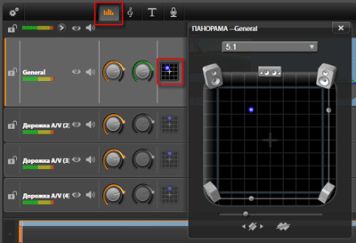 Следующие кнопки, расположенные чуть правее, тоже не для красоты сделаны. Первая из этих кнопок включает отображение на таймлинии дополнительных инструментов, предназначенных для работы с аудио: два регулятора громкости (общая громкость и громкость в текущем положении клипа) и кнопку вызова модуля регулировки объёмного звука (Панорама). Если звук в клипе пятиканальный, то пользователь будет иметь возможность произвести сдвиг в любую сторону.