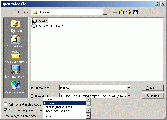 Первой полезной функцией VirtualDubMod является возможность автоматического создания скрипта AviSynth при открытии файла по шаблону фильтров-источников AviSource, DirectShowSource, Mpeg2Source (для файлов d2v).
