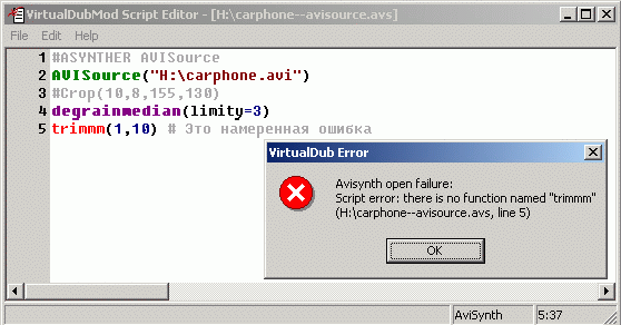 Прелестной особенностью редактора скриптов является подкрашивание ключевых слов. Базовые функции AviSynth подкрашиваются зеленым, функции плагинов — сиреневым, слегка неверный синтаксис подкрашивается красным, цвет меняется по мере набора символов. Названия параметров и их значения редактором не проверяются, поэтому возможны ошибки, о которых сообщает AviSynth при обновлении по F5. Пример окна редактора и сообщения об ошибке («нет функции Trimmm, строка 5 скрипта») приведены на рисунке. Исправьте ошибку и обновите вид. Сообщение об ошибке можно скопировать в буфер, нажав Ctrl-C (и вставить его в свое сообщение на форуме).