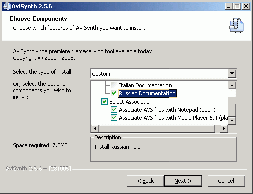 Для использования Avisynth, его, как и другую программу, надо сначала установить в систему (поддерживаются Windows95 и выше). Загрузив дистрибутив последней стабильной версии (2.5.6a на момент написания статьи), запустите установку, не забыв отметить флажком опции установки английской и русской документации, как на рисунке.