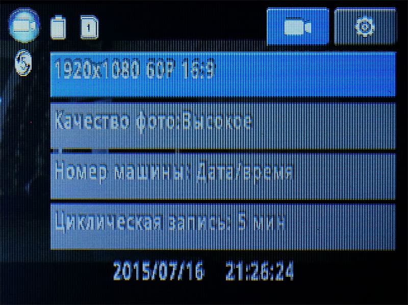 Лаконичное служебное меню, отображаемое на дисплее камеры, разбито на две категории: настройка параметров текущего режима (видеокамера/фотоаппарат), и системные настройки. Как уже говорилось, список опций неполон — в мобильном приложении можно отыскать пункты, которые здесь отсутствуют.