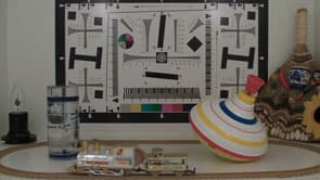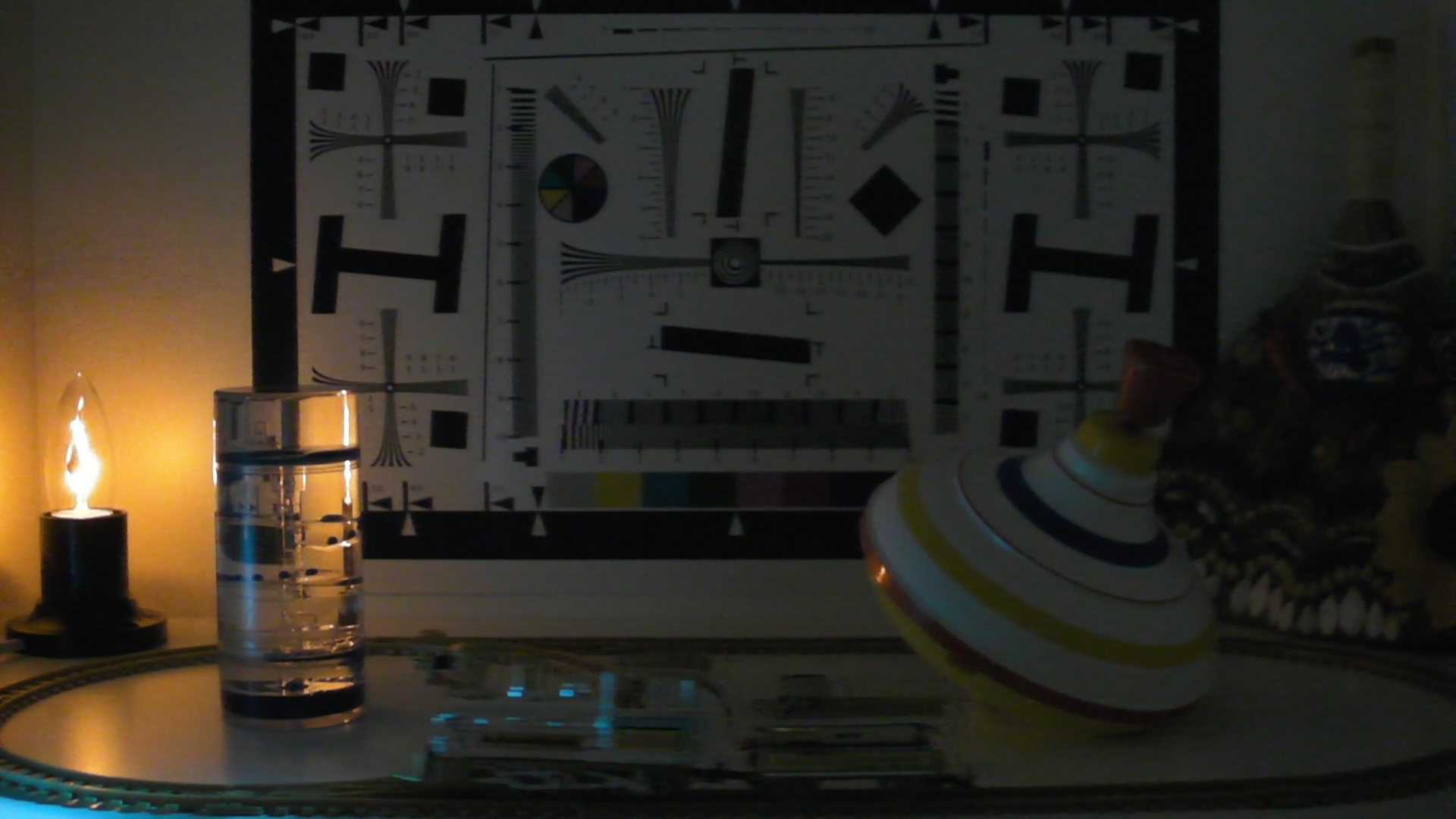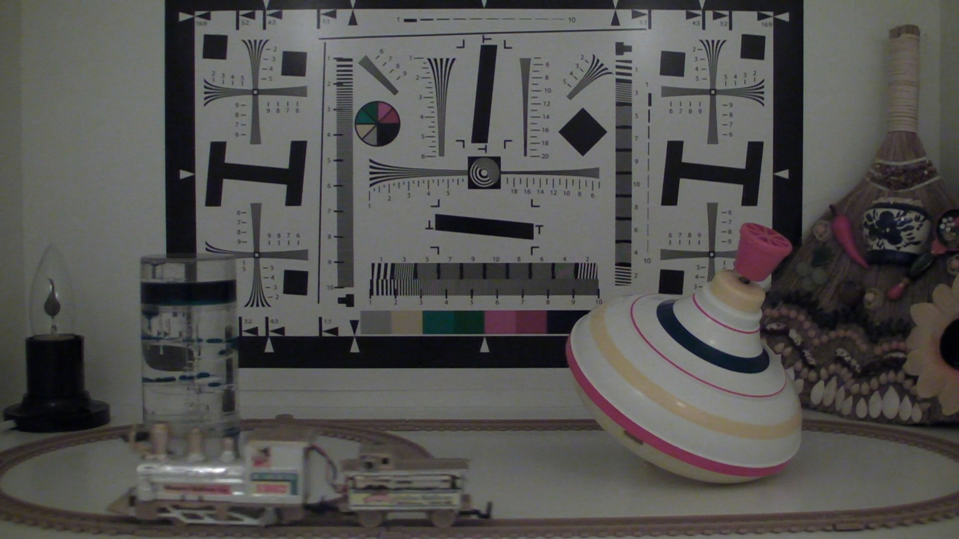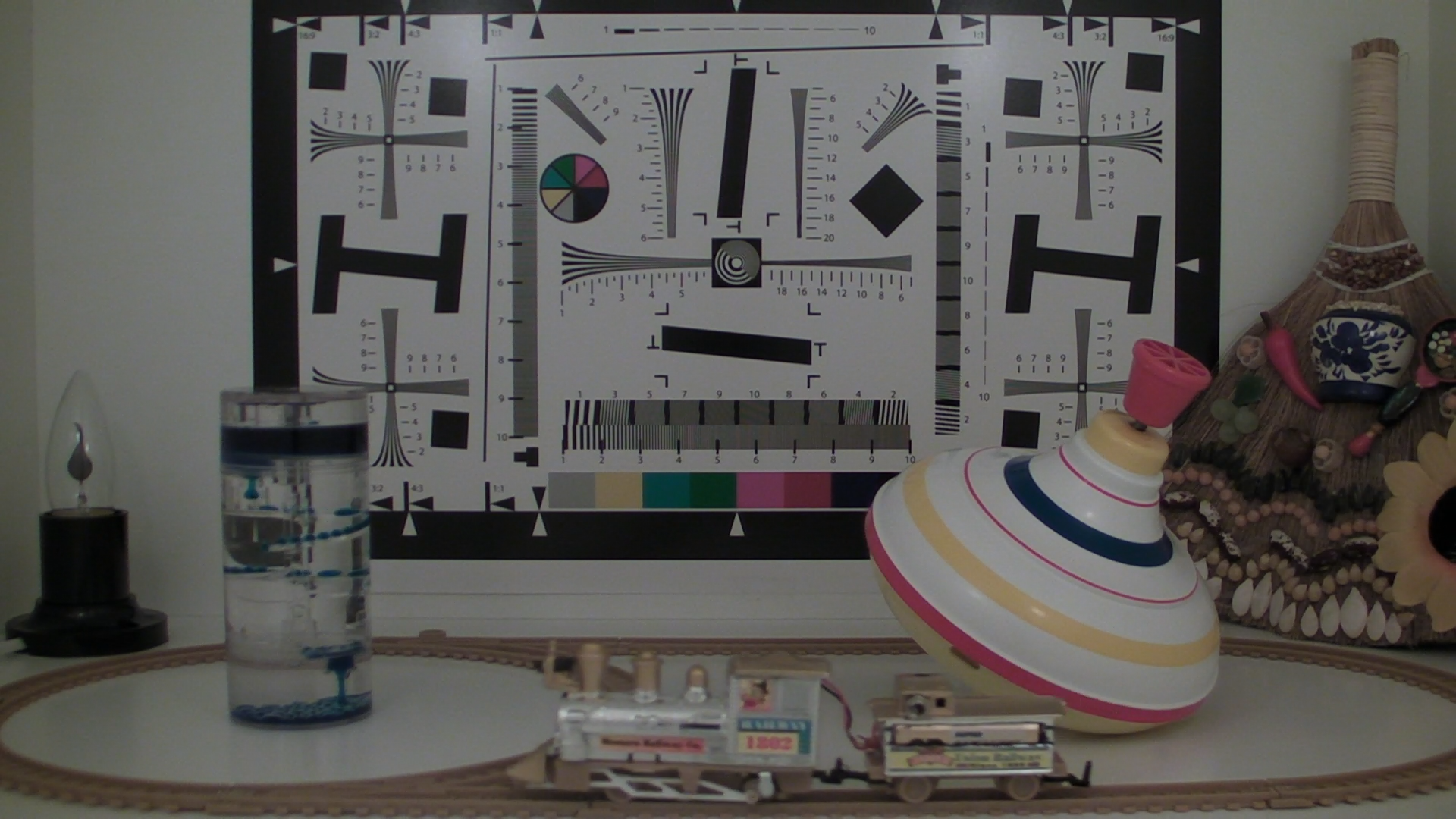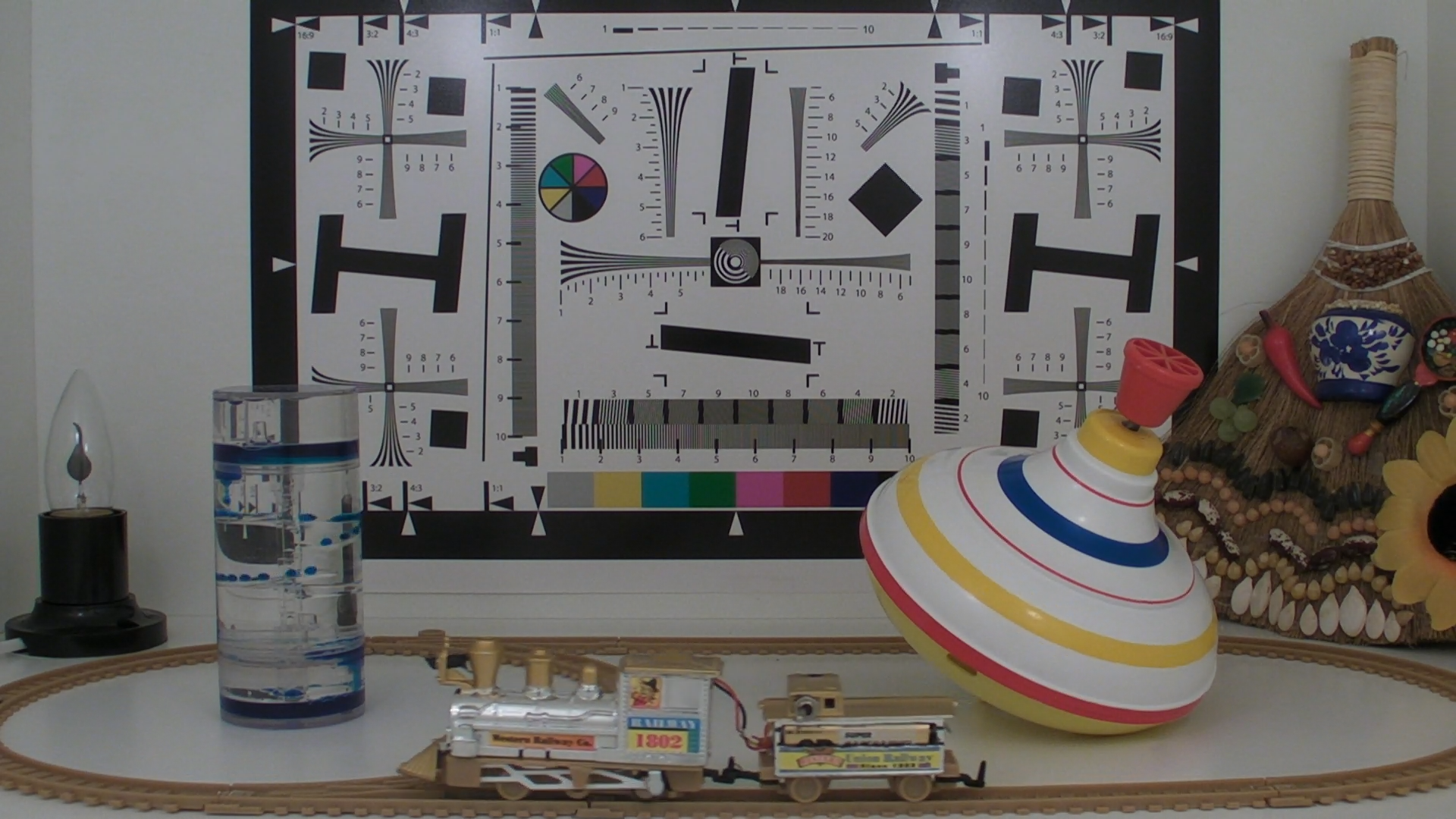 Остаётся невыясненным вопрос: что, собственно, снимать будем? Не хочется изобретать велосипед, также не хочется перегружать бокс всякой цыганщиной. Достаточно будет пустить бегающий по овалу паровозик с тендером, да поставить в центр композиции жидкие часы, отсчитывающие капельки синей жидкости. Живость картине придадут пластмассовая юла да разместившийся в углу небольшой разноцветный, имеющий много деталей сувенир из цикла "народное творчество". "Научность" тестирования подчеркнём специальной таблицей, отпечатанной в фотолаборатории на матовой фотобумаге.