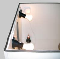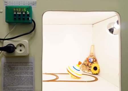 Данный тестовый бокс снабжён внутренним освещением, представляющим собой две обыкновенных матовых лампы накаливания по сто ватт каждая (Philips). К сожалению, цветовая температура лампы накаливания может меняться в зависимости от фирмы-изготовителя, особенностей внешнего напыления и/или подаваемого на эту лампочку напряжения. Поэтому, повторяем, не станем гнаться за созданием цветовых условий, идентичных, скажем, съёмке на зелёном берегу синего озера в 12 часов дня солнечного августа в следующий раз эти условия смоделировать будет невозможно. Воспользуемся тем, что можно сделать: имитировать уровень освещённости.