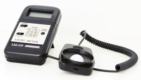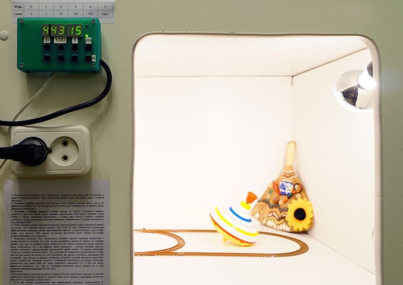Вернёмся к методике: поскольку речь идёт всё-таки о съёмке, проводимой любителями, то стандартными ситуациями, в которых они оказываются с камерой в руке, представляются следующие: съёмка на улице с разным уровнем освещённости, съёмка при искусственном освещении, и съёмка в почти полной темноте. Как же сымитировать в этом нашем ящике нужный уровень освещённости, похожий на вышеперечисленные ситуации? Воспользуемся цифровым портативным измерителем освещённости (люксметром).