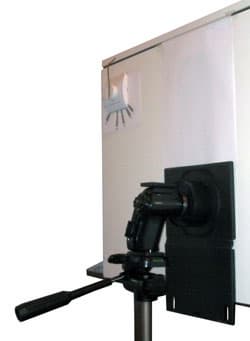 Во-первых, следует позаботиться о чистоте эксперимента: лишний свет, случайно попавший внутрь бокса, нам совсем ни к чему. Поэтому на время съёмок передняя щель ящика будет прикрываться. Но этого мало. Дело в том, что лампочки, находящиеся внутри ящика, могут отбрасывать свет непосредственно в объектив камеры и от этого нежелательного эффекта мы отгородимся в буквальном смысле слова. Используем этакую трубку, в которую помещается объектив тестируемой видеокамеры. Правда, здесь может быть осложнение, ведь не все аппараты имеют конструкцию, предусматривающую выдвинутый вперёд объектив. Получается, что нам придётся каждый раз подстраивать внешнюю светозащитную конструкцию под форм-фактор новой видеокамеры. Впрочем, если ситуация будет совсем уж сложной не побрезгуем и черной накидкой, которая "в древности" широко использовалась фотографами.