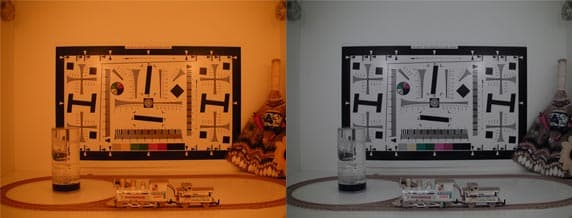 Нам пока ещё неизвестны модели видеокамер, не имеющие ручного переключения режимов, как то автоматический, солнечно, пасмурно, лампа накаливания, утром на лыжах и т.д. Поэтому все последующие съёмки станем проводить, принудительно переключая тестируемые видеокамеры в режим лампа накаливания, если такой имеется (в крайнем случае выставим ББ вручную по листу белой бумаги). Предложение снимать "на автомате" не проходит: автоматический баланс белого штука, конечно, хорошая, однако срабатывает далеко не всегда и не везде. Например, вот так снимает одна (неважно какая) видеокамера в автоматическом (слева) и ручном (справа) режиме: