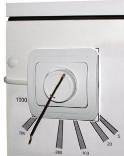 Нам эти цифры необходимы в других, практических целях: необходимо проградуировать диммер, отвечающий за подачу напряжения на внутреннее освещение нашего бокса. Данный электроприбор пришлось немного доработать устранить люфт рукоятки, сделав её ход более тугим и точным (в этом помогли отвёртка, пассатижи, немного ниток, резиновая прокладка, напильник и чуток смекалки). Правда, после такой экзекуции положение рукоятки немного сбилось (на десяток градусов), но это не имеет значения, ведь поверка самодельного стенда ещё не проводилась. После того, как мы разобрались с этим турецким изделием китайского происхождения, осталось лишь поместить люксметр в прорезь бокса, и, поворачивая диммер, проградуировать шкалу. Как только на экране люксметра появится очередная заветная цифра в соответствующем месте ставится риска.