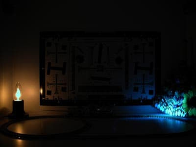 Но разве мы забыли о съёмке в почти полной темноте, когда люксметр показывает загадочный ноль? Нет, прекрасно помним. Для этого снабдим паровозик белым светодиодом, призванным имитировать прожектор, освещающий локомотиву путь. Ну а роль походного костра пусть сыграет мерцающая лампа-свеча мощностью три ватта.