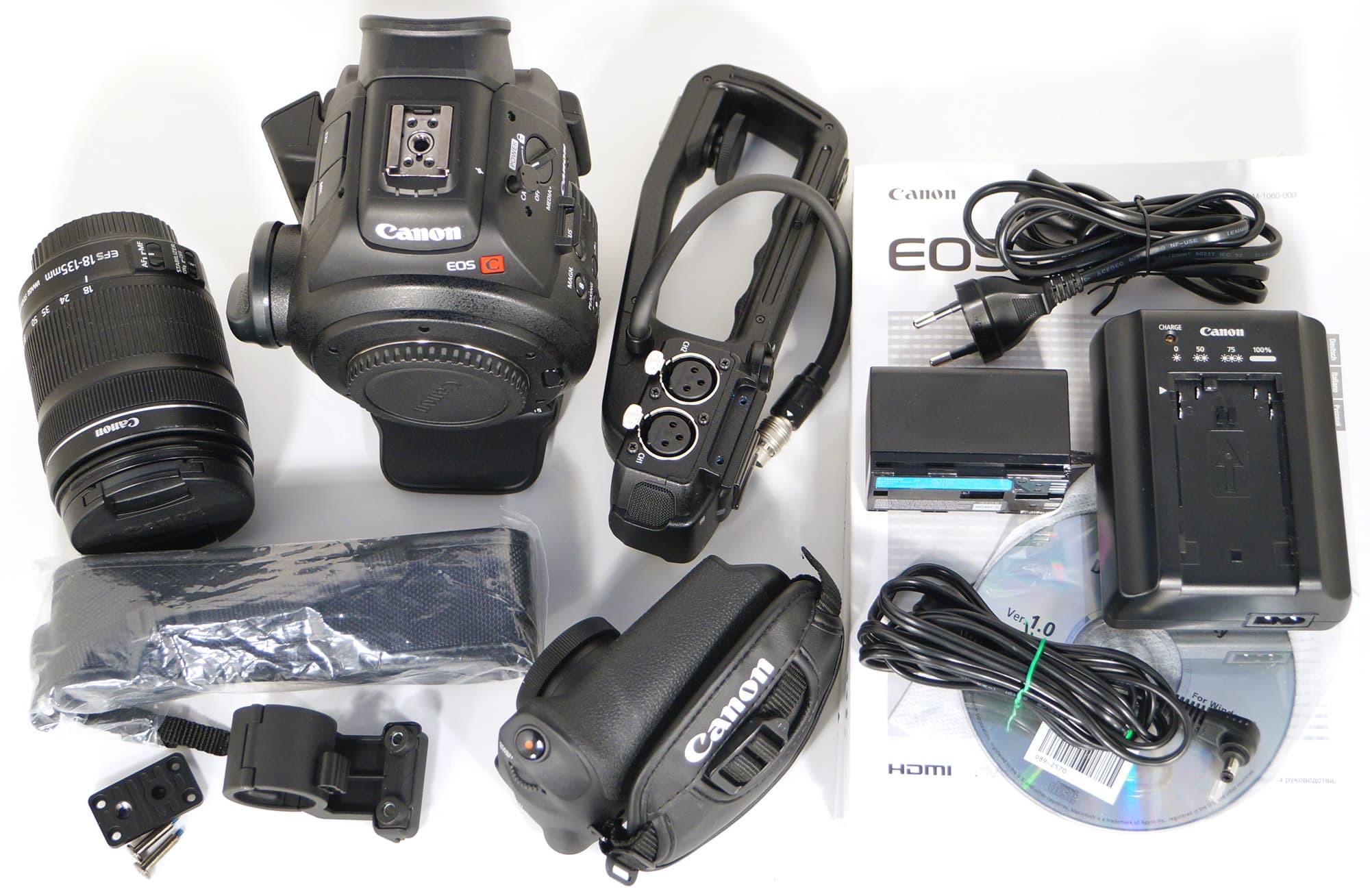 Комплектность, которая представлена на фото ниже, может отличаться от «магазинной». Тем более, если иметь в виду объектив. Ведь данная камера, в отличие от любительских видеокамер и аппарата полупрофессионального уровня, не имеет собственного встроенного объектива, а может работать с любым подходящим по типу крепления: EF или EF-S. Впрочем, неотъемлемые от камеры предметы назвать несложно. Это верхний управляющий блок-рукоятка для переноски и удерживания и боковой блок, также оснащенный рукоятью, только мягкой.