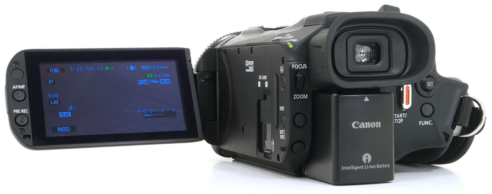 Откидной монитор оснащен двумя дополнительными кнопками, расположенными по краю рамки: AF/MF (переключение режима фокусировки) и Pre Rec (включение режима предварительной записи, или постоянной записи в буфер). Эти кнопки также имеют нумерацию, 1 и 2. Для чего? Разумеется, чтобы использовать их по своему усмотрению, назначив на них любое из доступных действий. Сенсорный монитор емкостного типа имеет диагональ 3,5″, разрешение 1,23 Мп и двухступенчатую регулировку яркости. На торце корпуса камеры находится переключатель, активирующий ту или иную функцию регулировочного кольца: фокус или зум. Ниже расположены две кнопки без названий, обозначенные цифрами 3 и 4. Как нетрудно догадаться — это очередные программируемые кнопки, на которые можно «навесить» любую доступную функцию. Расположение этих кнопок больше рассчитано на съемку с уровня глаз, пользуясь видоискателем, поскольку данные кнопки не увидишь и не нащупаешь, если снимаешь «от бедра».