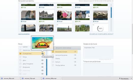 По окончанию загрузки файлов пользователю будет предложено ввести дополнительные данные о фильме, и выбрать его миниатюру, которая берется из закачанных видеофайлов либо фотографий.