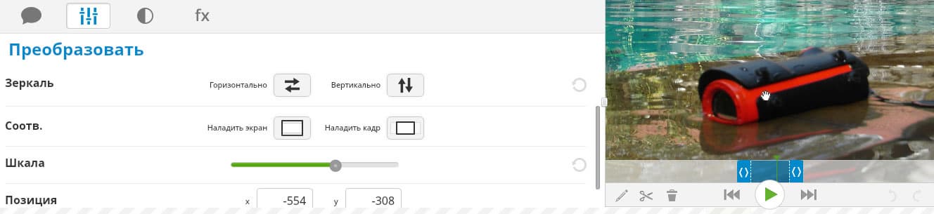 Как уже говорилось, отдельные клипы можно подвергнуть несложной трансформации: изменить размер и положение, повернуть или отразить.