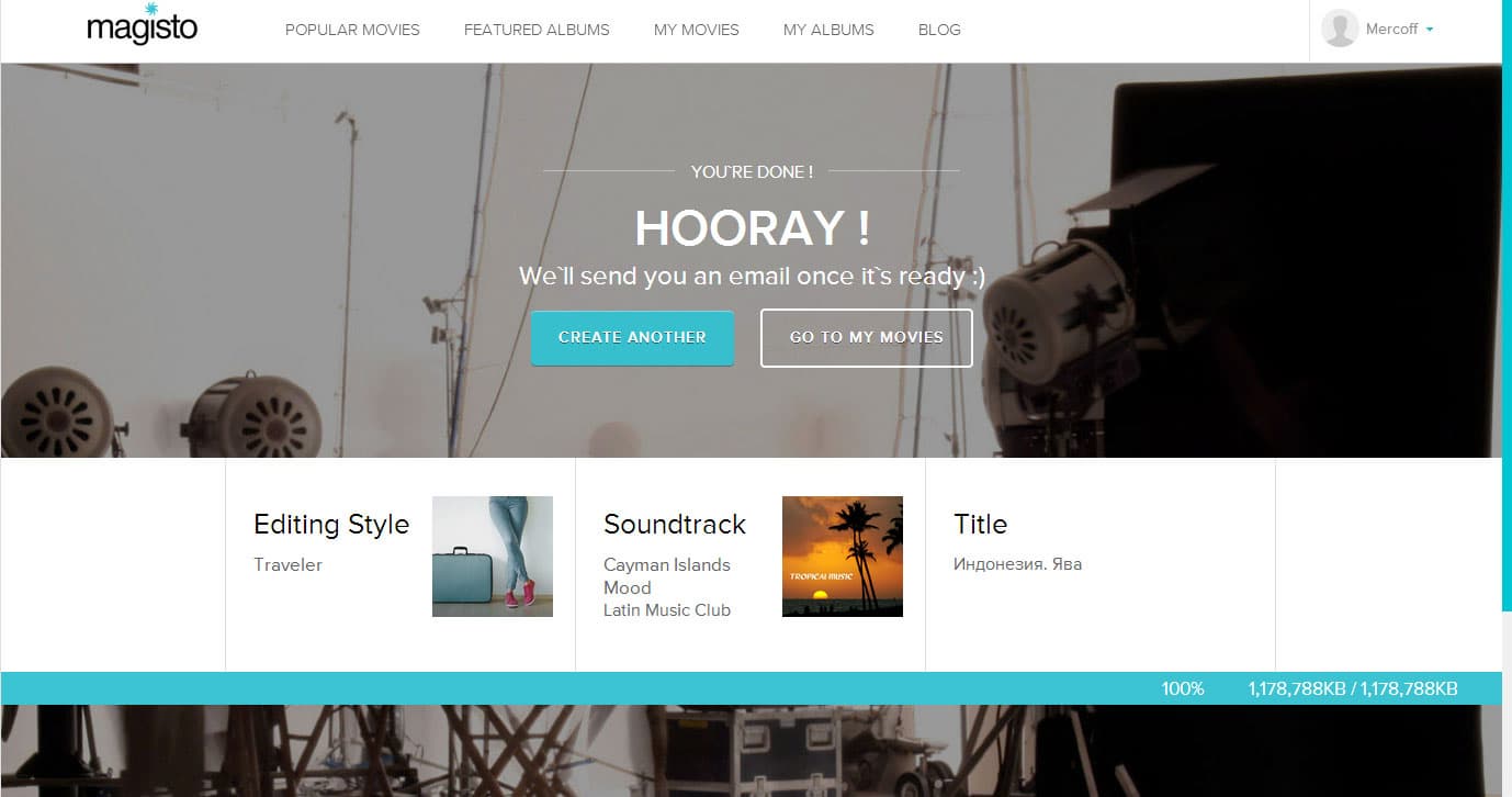 Пока мы подбирали шаблон и звуковое сопровождение, сервис потихоньку закачивал выбранные ранее файлы. Как только мы определились со всеми шаблонами, Magisto начинает работу над фильмом. Но в первый раз ничего не получилось — процесс обработки «завис» на 99%, ни в какую не желая продвигаться дальше. Пришлось удалить все закачанное ранее, и повторить попытку. И снова замирание на 99%. В чем же дело? Судя по всему, сервису не нравится какой-то из видеофайлов. Еще раз проанализировав весь материал, мы выяснили, что один из видеофайлов не имеет звуковой дорожки. Ну а откуда ей взяться, если этот видеофайл представляет собой интервальную съемку заката, сделанную на берегу Индийского океана? Так и быть, обойдемся без заката — пришлось пропустить импорт данного видеофайла. Теперь остается лишь подождать e-mail, в котором будет сообщено о готовности фильма.