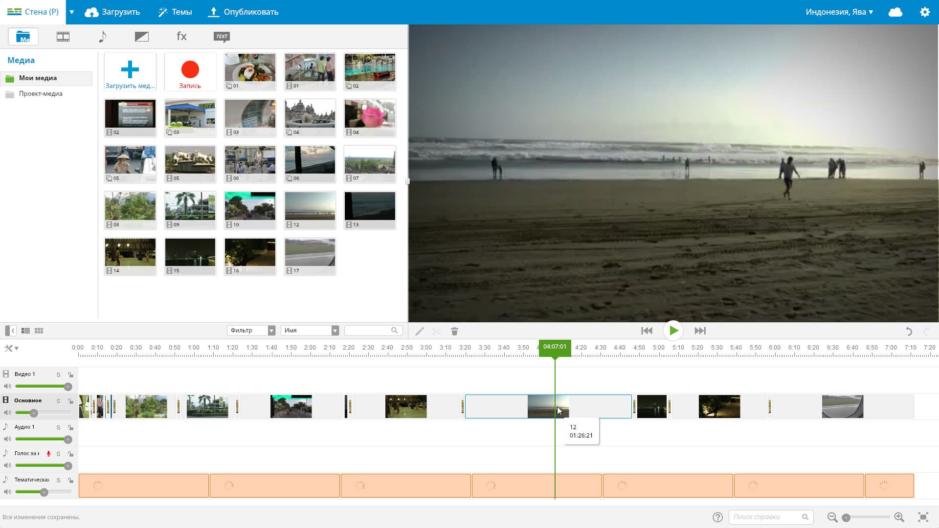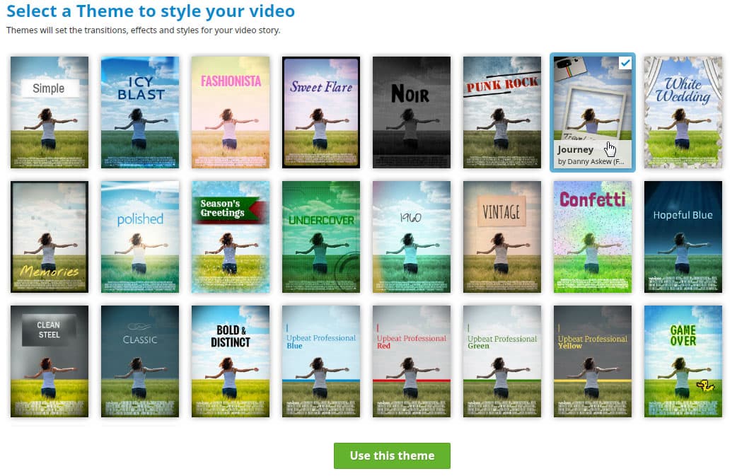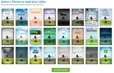Жаль, но данный ресурс не располагает средством полностью автоматического монтажа видео. Основные операции, такие, как подрезка клипов, их размещение на таймлинии, редактирование параметров некоторых элементов, настройка уровня звука — эти операции производятся только вручную. Единственная «отдушина», позволяющая как-то автоматизировать процесс пусть не монтажа, но хотя бы оформления — наличие Тем. Они представляют собой такие же шаблоны оформления, что встречались нам в двух предыдущих видеосервисах. Выбор одного из шаблонов «перекрашивает» весь фильм, расставляет в нужных местах тематические переходы, добавляет к видео соответствующие шаблону эффекты, фильтры и звуковое сопровождение. Угадайте, какой шаблон мы выбрали? Ну конечно, Journey.