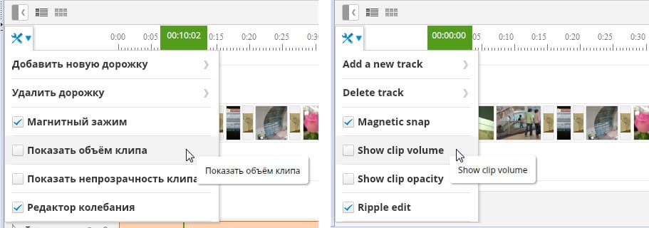 Перевод большинства пунктов меню хромает с точки зрения пользователя, уже знакомого в видеомонтажным ремеслом. Но при желании нетрудно догадаться, какой пункт за что отвечает.