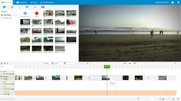 Разумеется, сама архитектура такого облачного видеоредактора не предусматривает наличия возможностей профессионального софта. Да, перед нами — несложная программа нелинейного видеомонтажа. Здесь все как во «взрослых» видеоредакторах: иерархическая копилка файлов с вкладками, позволяющими перейти к наборам футажей, музыкального сопровождения и титров; окно предварительного просмотра таймлинии; сама таймлиния со всеми необходимыми инструментами, включая добавление дополнительных (overlay) видеодорожек.