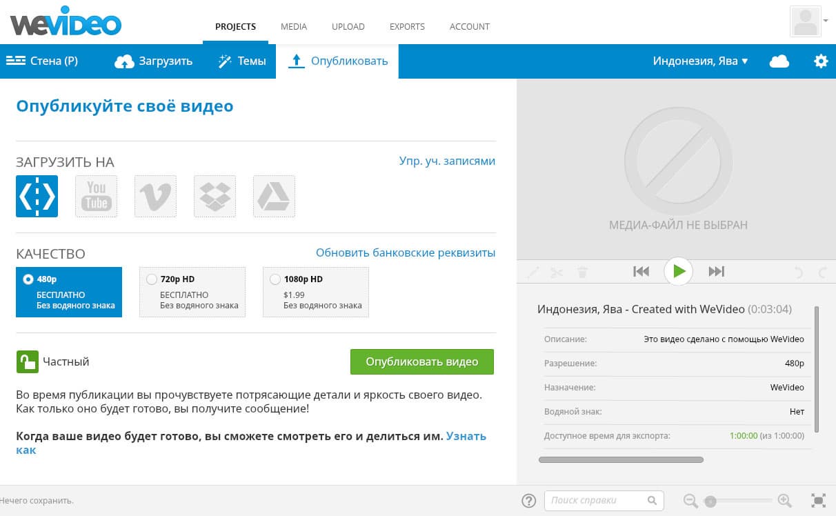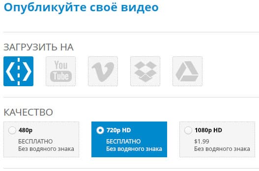 Данная команда открывает список доступных сервисов: YouTube, Vimeo, Drpobox и Google Drive. Также здесь имеется возможность создания копии фильма для скачивания, на выбор предлагается три варианта. Как видим, за последний, «старший» вариант, придется еще немного доплатить, иначе видео будет снабжено логотипом WeVideo.