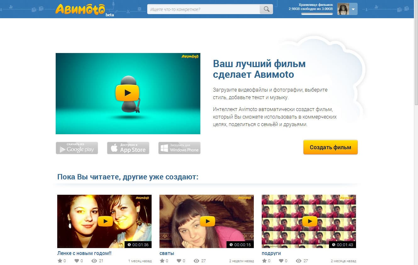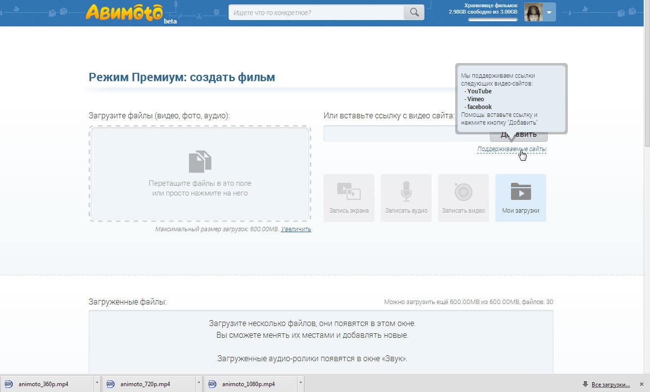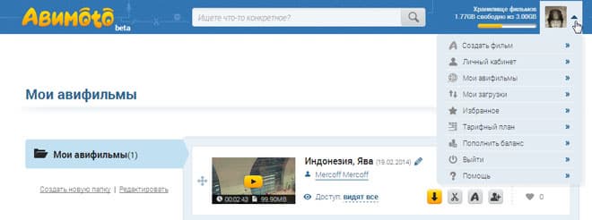 Авиmoto сохраняет на своем сервере загруженные пользователем материалы, то есть, представляет собой этакий аналог облачного файлового хранилища. Таким образом, не требуется загружать повторно эти материалы, если первый вариант фильма не понравился, и захотелось испытать другой шаблон. В любой момент можно дать команду на повторный монтаж фильма, выбрав в качестве исходного материала загруженный ранее контент.