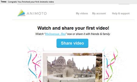 Время, за которое создается фильм, подсчитать затруднительно. Любой понимает, что на анализ видео, подрезку, наложение эффектов и переходов, но более всего на перекодирование, системе требуется какое-то время. Чтобы не тратить время впустую, пользователю, давшему команду на создание фильма, строго рекомендуется отойти от компьютера/ноутбука/планшета, и заняться насущными делами. Чуть позже, освободившись и проверив свою электронную почту, вы наверняка обнаружите вот такое поздравление: