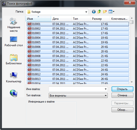 В появившемся диалоговом окне открытия файла следует выбрать все файлы изображений, которые вы желаете импортировать в качестве одной последовательности (имена файлов должны представлять собой цифровую возрастающую последовательность). В следующем примере мы импортировали последовательность графических файлов, полученных в программе ParticleIllusion.