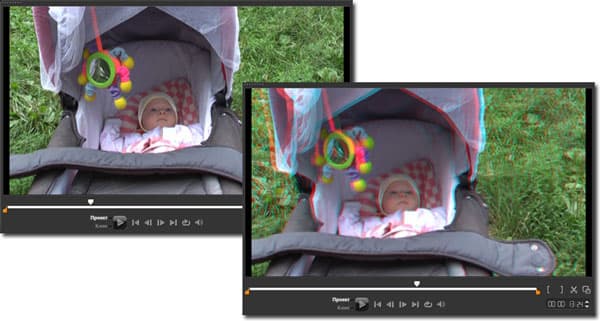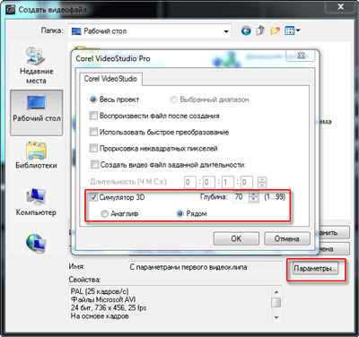 Кстати говоря, реализация данной возможности не осталась ограниченной одним-единственным анаглифическим способом сохранения объёма. Этот способ — самый простой, для просмотра такого видео не требуется никаких специальных средств и мониторов. Красно-зелёные очки — и вперёд, на поиски 3D (кстати, такими очками комплектуются коробочные версии Corel VideoStudio Pro X4). Для смены способа сохранения 3D требуется нажать кнопку Параметры и выбрать не Анаглиф, а другой способ, имеющий название Рядом (ай да переводчики…). Здесь же позволяется настроить глубину псевдообъёма, которая варьируется в пределах от одного до 99 пунктов.