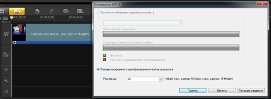 Как известно, Corel VideoStudio имеет механизм, благодаря которому многие видеофайлы, соответствующие определённым стандартам, не пережимаются в процессе экспорта. Разумеется, это непережатие происходит лишь в том случае, если к экспортируемому клипу не применялись эффекты или фильтры. Наглядно работу этого механизма можно оценить, вызвав специальный модуль — Оптимизатор MPEG:
