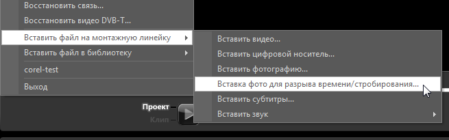 Добавление такого материала производится командой Файл → Вставить файл на монтажную линейку → Вставка фото для разрыва времени/стробирования (жутковатый перевод, верно?).