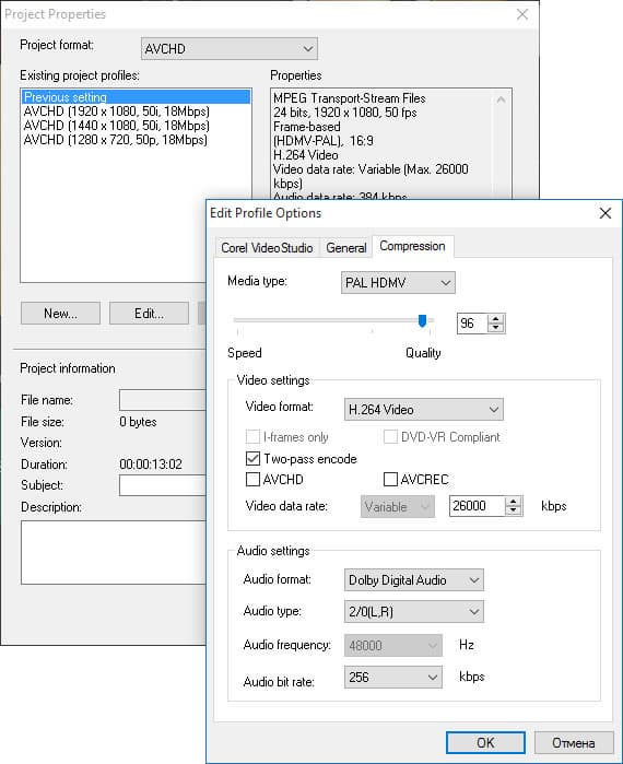 | Проект H.264 1920×1080 50p | 0:42, CPU 95% | 0:23, CPU 90% |
