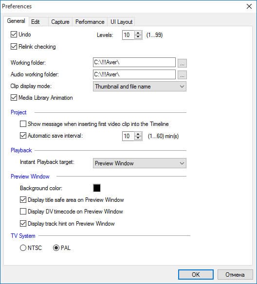 | Общий настройки: количество шагов отката действий, расположение временных папок (желательно размещать их на быстрых дисках), выбор ТВ-системы | Параметры обработки видео- аудиоматериала, длительность переходов по умолчанию | Параметры захвата и представления захваченного материала | Включение/отключение технологии прокси (создание временных файлов), облегчающей работу на слабых компьютерах; задействование аппаратной поддержки |