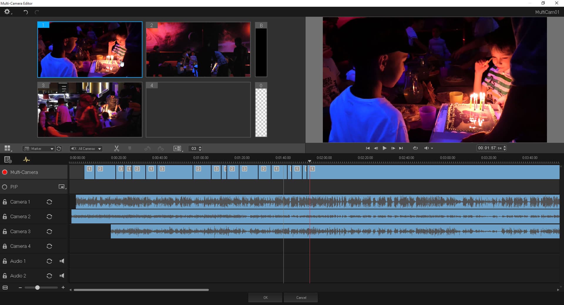 Наконец, можно приступать к многокамерному монтажу, который напоминает обычный линейный монтаж в реальном времени. Запустив воспроизведение таймлинии, пользователь контролирует происходящее во всех трех окнах и время от времени меняет ракурсы, щелкая мышкой по нужному слоту.