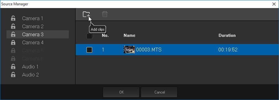 Наполнение проекта видеоматериалом производится в окне Source Manager (можно перевести как менеджер источников). Здесь можно импортировать видео с разных камер, разложив его соответственно нумерации по разным слотам, которые имеют названия Camera 1, Camera 2 и т. д.
