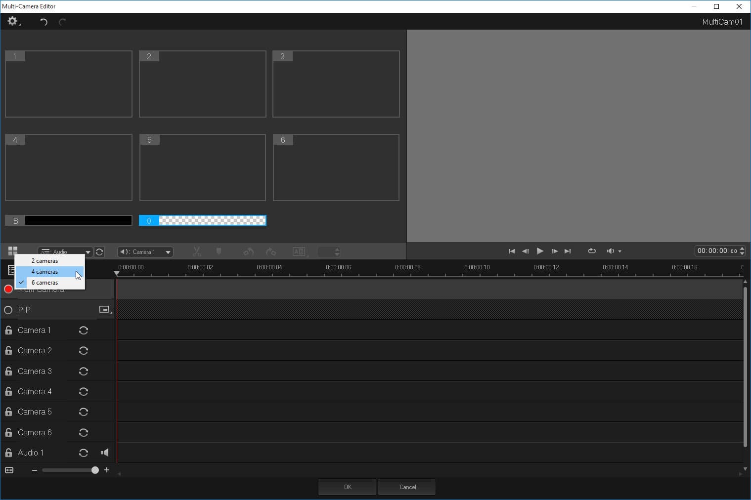 Редактор мультикамерного монтажа представляет собой отдельное рабочее пространство с классическим «видеоредакторным» расположением окон: монитор, таймлиния и копилка файлов. С тем отличием, что в этой копилке находится материал с разных камер. Поскольку в нашем распоряжении имеется материал, снятый лишь тремя камерами, избавимся от ненужных слотов, переключив модуль в четырехкамерный режим. Пусть хотя бы один слот пустует, а не три.