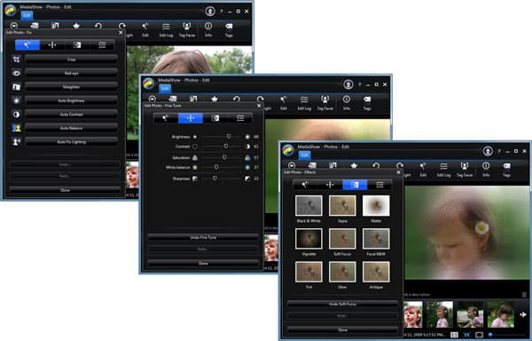Прежде всего, не вредным будет подредактировать фотографии, которые мы пытаемся превратить в долгую DVD-память. Для этого требуется выделить нужные снимки (или сразу все: Ctrl+A) и нажатием кнопки Edit перейти в режим редактирования. В данном режиме пользователю доступны несколько стандартных операций, от обрезки изображения или поворота его на произвольный угол до ручной цветокоррекции и добавления небольшого количества красивых эффектов.