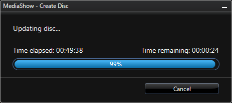 Запись окончательного проекта на диск осущетвляется кнопкой Burn. По нажатию данной кнопки тут же начинается просчёт, длящийся довольно долго. Так, диск длительностью 35 минут (31 минута AVCHD 1920x1080 и несколько десятков фотографий, трансформированных в 4 минуты видео) просчитывался и записывался на DVD-RW диск около 50 минут, при этом в получившемся диске видео было закодировано с максимальным битрейтом 9000 Кбит/сек, а звук стерео AC-3 256 Кбит/сек.