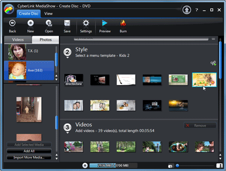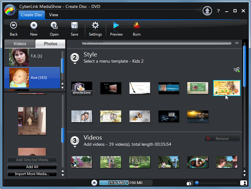 Здесь мы видим ещё одну подпрограмму, включающую все необходимые инструменты для простейшего авторинга. Выбор стиля оформления диска, импорт дополнительного содержимого как из существующих фото- видеоколлекций, так и с жесткого диска.