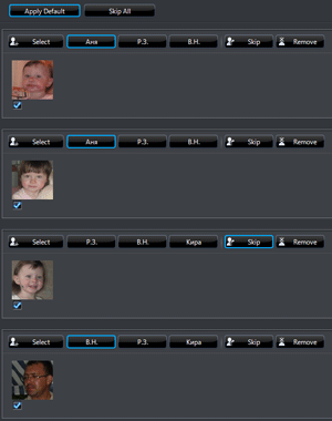 Чуть правее находятся кнопки с уже известными программе именами, которые, как кажется электронному мозгу, наиболее соответствуют найденному лицу. Одно нажатие на нужную кнопку и выбранному лицу присваивается уже известное программе имя. Если же программа не смогла идентифицировать лицо, то по умолчанию активной становится кнопка Skip, нажав которую, вы пропустите добавление данной персоны в список нужных вам имён.