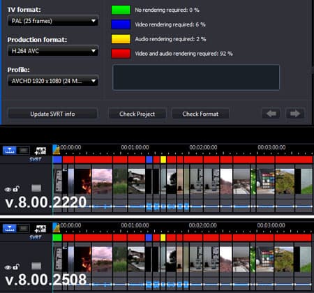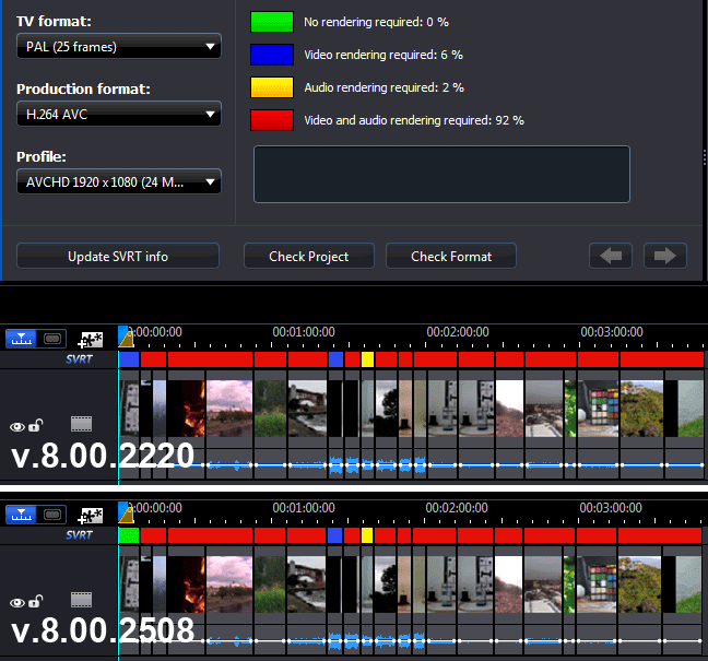 Ну что-ж... Ура. Титры на AVCHD-диске — это, как минимум, радует! Что же касается информации о появившейся поддержке видео, снятого AVCHD-видеокамерами CANON... Довольно трудно всё это проверить и перепроверить (да и требуется ли?). Ну хорошо, устроим программе очную ставку с ней же самой, только слегка посвежевшей после установки упомянутого патча. В качестве понятых будут выступать файлы с разных видеокамер: CANON HF200, JVC GZ-HD7ER-2, JVC GZ-HD7ER, JVC GZ-MG67E, PANASONIC-SDR-SW21, PANASONIC AG-HMC154, PANASONIC HDC-TM300, PANASONIC LUMIX GH1, PANASONIC SDR-H80, SAMSUNG HMX-H104, SAMSUNG HMX-R10, SAMSUNG HMX-U10, SAMSUNG SMX-K44, SANYO VPC-CA9, SANYO VPC-HD700, SANYO VPC-HD2000, SONY HDR-CX12, SONY HDR-SR7, SONY XR520, SPEED HD-50Z, TOSHIBA CAMILEO P30. Именно в таком порядке эти файлы и расположились на таймлинии в ожидании допроса. Теперь взглянем на SVRT-информацию, полученную до и после установки патча — это нетрудно сделать путём создания и последующего сравнения скриншотов. Взглянув на рисунок, видим, что поддержка AVCHD-видеокамер Canon действительно введена! Если в предыдущей версии файл с такой видеокамеры полностью перекодировался, то теперь нужда в этом пропала. Взгляните на таймлинию: самый первый файл — как раз с видеокамеры Canon HF200.