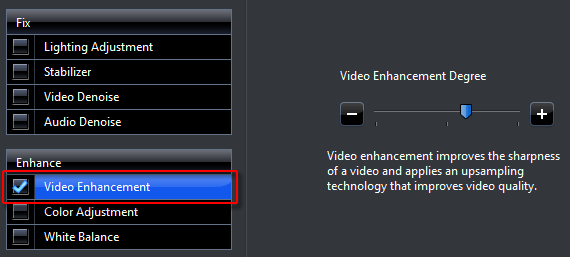 Однако в программе Cyberlink PowerDirector 8 довольно трудно найти хотя бы намёк на существование такой или похожей технологии. Всего лишь красивые слова на официальном сайте — ничего более. Даже встроенная в программу справка умалчивает об этом волшебном апскейлинге, ни слова нет о том, как его задействовать, или, наоборот, деактивировать. Впрочем, существование некоего улучшайзера удалось найти в описании к одному из инструментов, входящих в комплект Fix / Enhance. Имя его — Video Ennhancement.