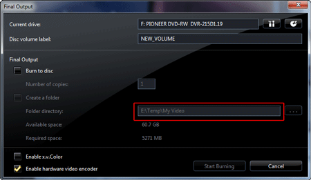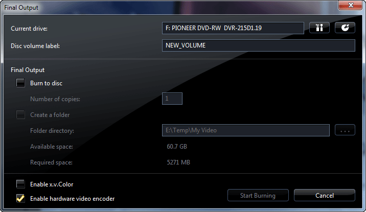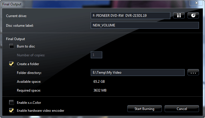 Просчёт и прожиг Blu-ray диска производится только при наличии соответствующего физического привода и чистой в нём соответствующей же болванки. Увы, но так и есть. Даже если снять флажок с пункта Burn to disc (Прожечь диск), то пункт Create Folder (Создать папку) всё равно остаётся неактивным. А жаль, ведь кому-то обязательно захочется иметь пусть хотя бы образ такого диска — его можно вполне спокойно просмотреть на некоторых программных плеерах, и, возможно, даже аппаратных (с жёстким диском).