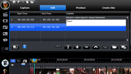 Ну а дальше всё просто: передвигая ползунок по таймлинии, в нужном месте требуется нажать плюсик, а в появившейся новой строчке вписать текст титров. Порядок, время появления и исчезновения, параметры шрифта — всё это регулируется здесь же. После того, как титры созданы, их можно экспортировать в файл титров *.SRT (импорт титров поддерживается в форматах *.SRT и *.TXT).