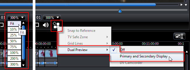 Второе и сразу же третье: изменение масштаба отображения видео в окне монитора, и (наконец-то!) полноэкранный просмотр монтируемого материала на втором мониторе либо камкордере. Этот полноэкранный просмотр включается специальной кнопкой, расположенной на панели инструментов окна монитора.