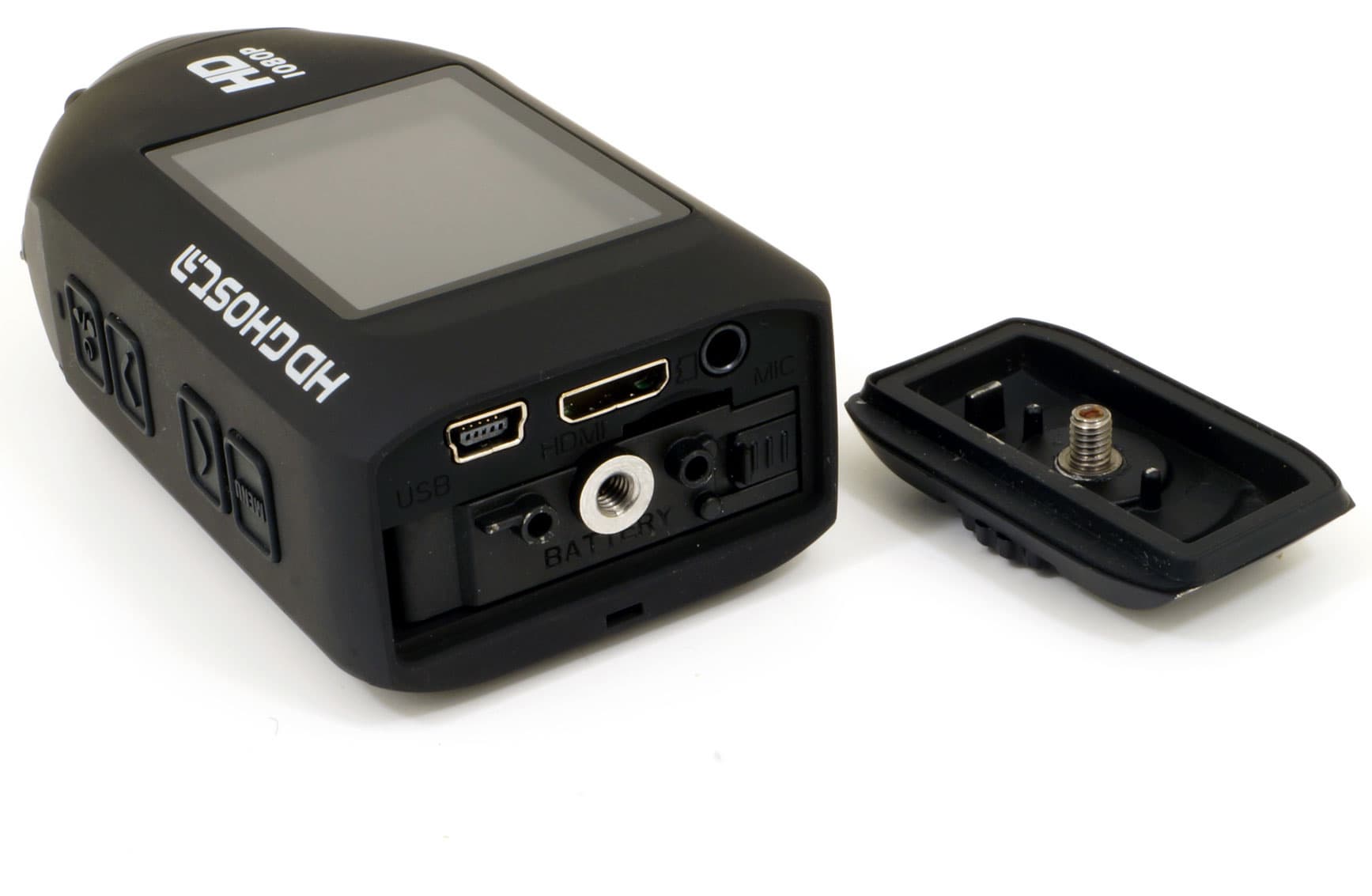 На стороне, обратной от ЖК-экрана, находится металлическое резьбовое отверстие со стандартной штативной резьбой. Отверстие обрамлено канавкой с зубчиками, исключающими самопроизвольный поворот камеры, которая закреплена с помощью прилагаемого универсального держателя. На этой же стороне корпуса расположен встроенный динамик, вмонтированный под множеством отверстий.