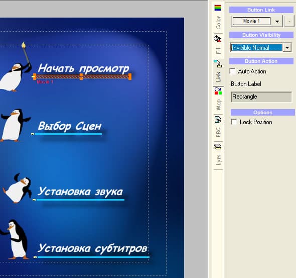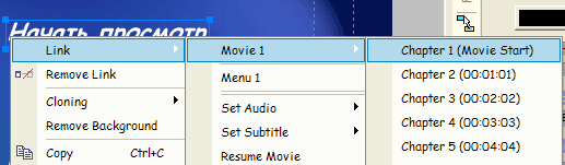 Теперь создайте ссылки для строк с текстом. Пока вы можете сделать ссылку только на первый пункт меню "Начать просмотр", так как фильм уже существует и его вы можете найти следующим образом: щелкаете правой кнопкой мышки по тексту, выбираете Link>Movie1>Chapter 1(Movie Start). Все просто.