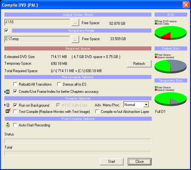 Появится окно компилирования DVD-видео диска. В этом окне нужно выбрать папку Output Folder, в которой будут созданы файлы DVD-видео, а также папку для хранения временных файлов.
