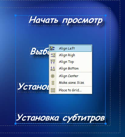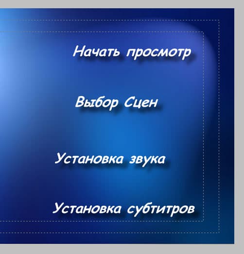 Фон готов. Теперь создадим само меню, пусть оно будет состоять из четырех пунктов: Начать просмотр, Выбор сцен, Установка звука, Установка субтитров. Для создания надписей нажмите на кнопку Аа и щелкните в том месте, где бы вы хотели расположить текст.