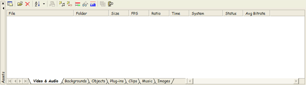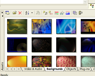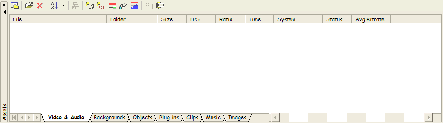 Она называется Assets window (окно, в котором будет накапливаться наше "имущество"). Сюда, а именно во вкладку Video & Audio, импортируются все видеофрагменты, картинки и звуки, нужные для работы. Остальные вкладки представляют собой различные, встроеные по умолчанию объекты: Backgrounds (фоновые рисунки), Objects (объекты), Plug-ins (плагины), Clips (клипы), Music (музыкальные фрагменты), Images (картинки). Импорт производится несколькими путями, первый путь самый простой: достаточно перетащить выбранный файл из Проводника Windows в это окно. Второй путь: нажать кнопку Import Files и выбрать нужный файл.