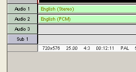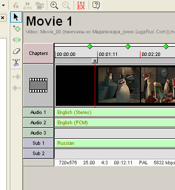 В DVD LAB Pro при выборе ссылки на звуковой поток второе действие всегда одинаково для всех ссылок. Меню для субтитров будет выглядеть так же, как и меню для аудио, с одним только различием: вы выбираете дорожки не звуковые, а субтитров. Однако, прежде чем выбрать дорожку, надо создать субтитры. Это делается в окне фильма, щелчком левой кнопкой мыши по названию SUB1 дорожки субтитров (фиолетового цвета).