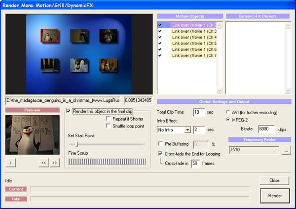 Что же мы видим в этом окне? Первое это картинка вашего меню, второе Motion Objects, то есть те объекты, на которые распространяется движение. Около каждого названия стоит флажок, сняв который, вы тем самым отключите создание двигающегося меню (в этом случае напротив названия появится красный крестик вместо флажка). Следующее за Motion Objects поле для настройки динамических эффектов (Dynamic-FX Objects)? отвечающее за настройку специальных эффектов, используемых как дополнение к Motion Menu. В нижней части окна показан кадр, с которого должно начинаться проигрывание меню. Пощелкайте мышкой в окне Motion Objects по названиям, и вы увидите, что в данном окне также меняется стартовый кадр. Правее от окна меню есть ползунок, передвигая который, можно выбрать другой начальный кадр. Это может пригодиться, когда не требуется совпадение первого кадра глав с тем, что будет показано на экране. Ну, и последняя часть это Global Settings and Outputs, то есть общие настройки вместе с настройками выходных параметров.