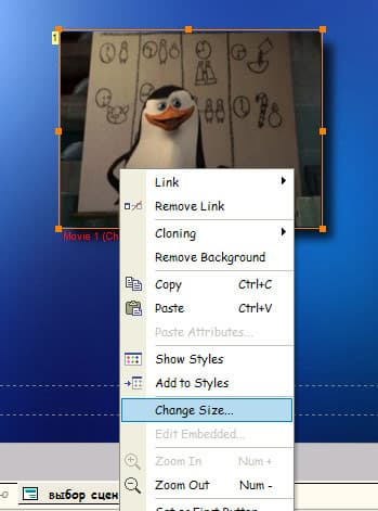 Нажмите кнопку Insert Chapter Still (Вставить первый кадр главы). Вы получите список фильмов вашего проекта и список всех глав в фильме. Просто выберите нужную главу и щелкните по ней мышкой, к примеру, Chapter 2. В центре вашего будущего меню появится видеофрагмент, кадр которого будет совпадать с кадром начала второй главы. Расположите его окно по вкусу, используя в том числе параметр Change Size (Изменение размера), который можно найти, щелкнув правой кнопкой мышки по самому кадру.
