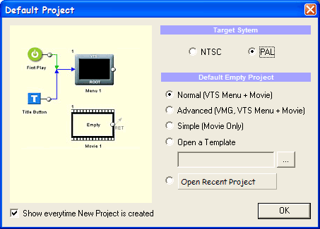 В первой строке нужно выбрать систему цветности проекта (PAL или NTSC). В России, как известно, используется PAL (установлена по умолчанию). Теперь необходимо выбрать тип вашего проекта. Для создания обычного DVD-видео достаточно отметить пункт Normal. Чем же отличается Advanced от Normal, что такое VTS и VMG и почему мы посчитали достаточным тип Normal? Каждый DVD диск состоит из набора фильмов (клипов) и меню, это и есть VTS, то есть своеобразная емкость, в которой и хранятся клипы и меню. В DVD LAB каждый VTS может содержать 99 фильмов (клипов) и 250 меню. Однако все меню и все фильмы (клипы) в одном VTS должны иметь одинаковые настройки и если вы поставили скажем пропорции 4:3, то и во всем проекте все клипы и меню будут иметь такие же пропорции, однако, если вы хотите тот же фильм смотреть еще и в широком формате, к примеру, 16:9, то необходимо создать дополнительное VTS с параметрами 16:9. А вот для того, чтобы DVD проигрыватель смог понять, что ваш диск включает в себя два VTS (4:3 и 16:9), и требуется создание VMG - Video Manager (Видео менеджер) меню. Из вышесказанного можно предположить, что обычный пользователь вряд ли станет создавать DVD диск с фильмом о том, как он весело провел время в Турции в двух, а то и трех форматах, поэтому в этом уроке используется только тип проекта Normal, чего вполне достаточно для создания любительского DVD-видео диска.